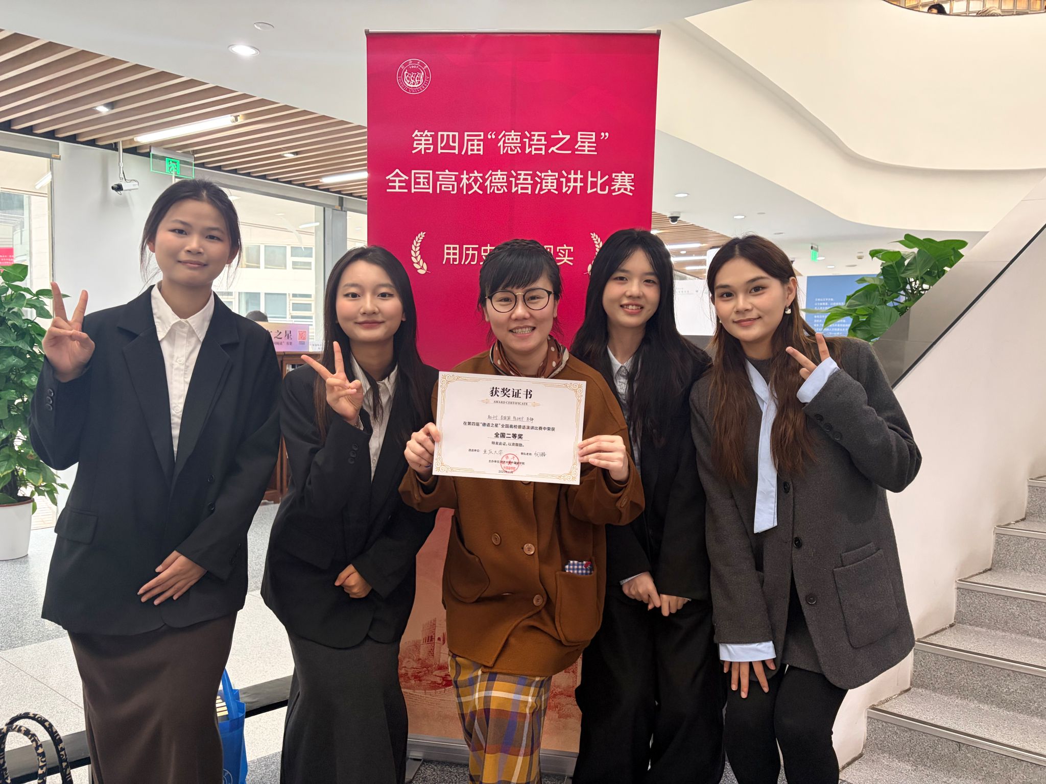 在向璐老师指导下,团队分工协作,赵子宁、李圆圆搭建框架并撰写讲稿,苏静、陈柯宇负责资料收集与PPT制作。比赛中,赵子宁以沉稳台风和流畅德语完成演讲,提问环节四位选手沉着应对、对答如流,展现出扎实的专业功底与深度思考,赢得评委一致认可。