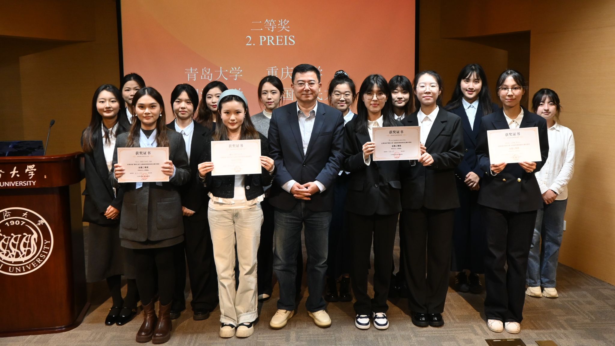 德语专业代表队凭借深刻的主题阐释、精湛的德语表达与出色的临场应变,从全国15支晋级队伍中脱颖而出,最终斩获全国二等奖,指导老师向璐荣获“优秀指导教师奖”。